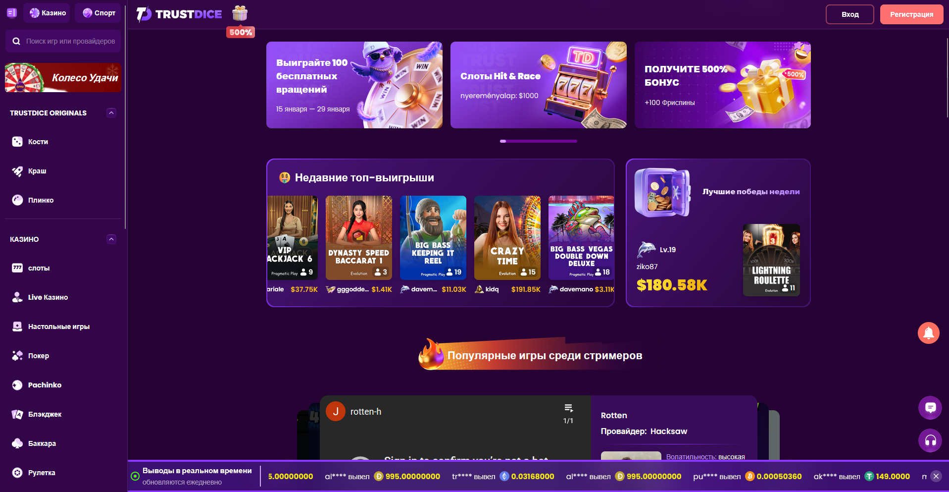 После входа главная страница Трастдайс отображает баннеры с текущими промо, быстрые кнопки на категории и популярные игры. В верхней части меню находится переключение между режимами: казино, ставки на спорт, live-столы и собственные игры Originals. Поисковая строка позволяет сразу найти нужный слот по названию провайдера или теме.