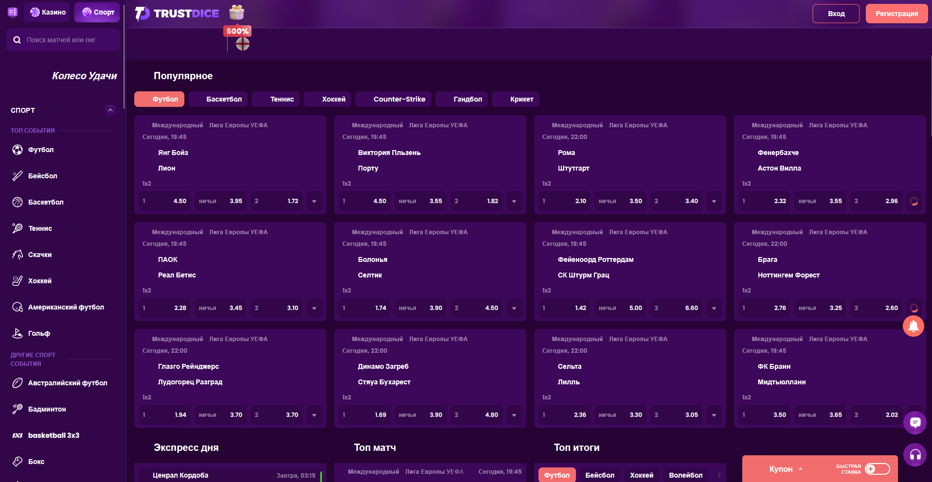 Футбол - самый популярный вид спорта в букмекерстве. БК Trustdice предоставляет по каждому матчу от 50 до 100 рынков. Для новичка достаточно знать базовые пять: 1X2, тотал, фора, двойной шанс и обе забьют. Остальные рынки (результат по таймам, первый гол, количество карточек) используются опытными игроками для более сложных стратегий.